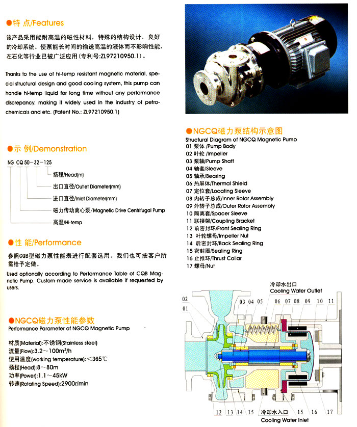 NGCQ型(耐高溫)≤450℃(水冷卻)磁力泵是采用內外磁鋼推拉傳遞,磁路中間采用隔離套將液體封閉在隔離套內,以靜密封取代動密封,使泵的過流部件處于密封狀態(tài),解決了其它泵的機械密封無法避免的跑、冒、滴之弊病。磁力泵選用耐腐蝕、高強度的工程塑料、鋼玉陶瓷、不銹鋼作為制造材料,因此具有良好的抗腐蝕性能,并可使被輸送介質免受染。
